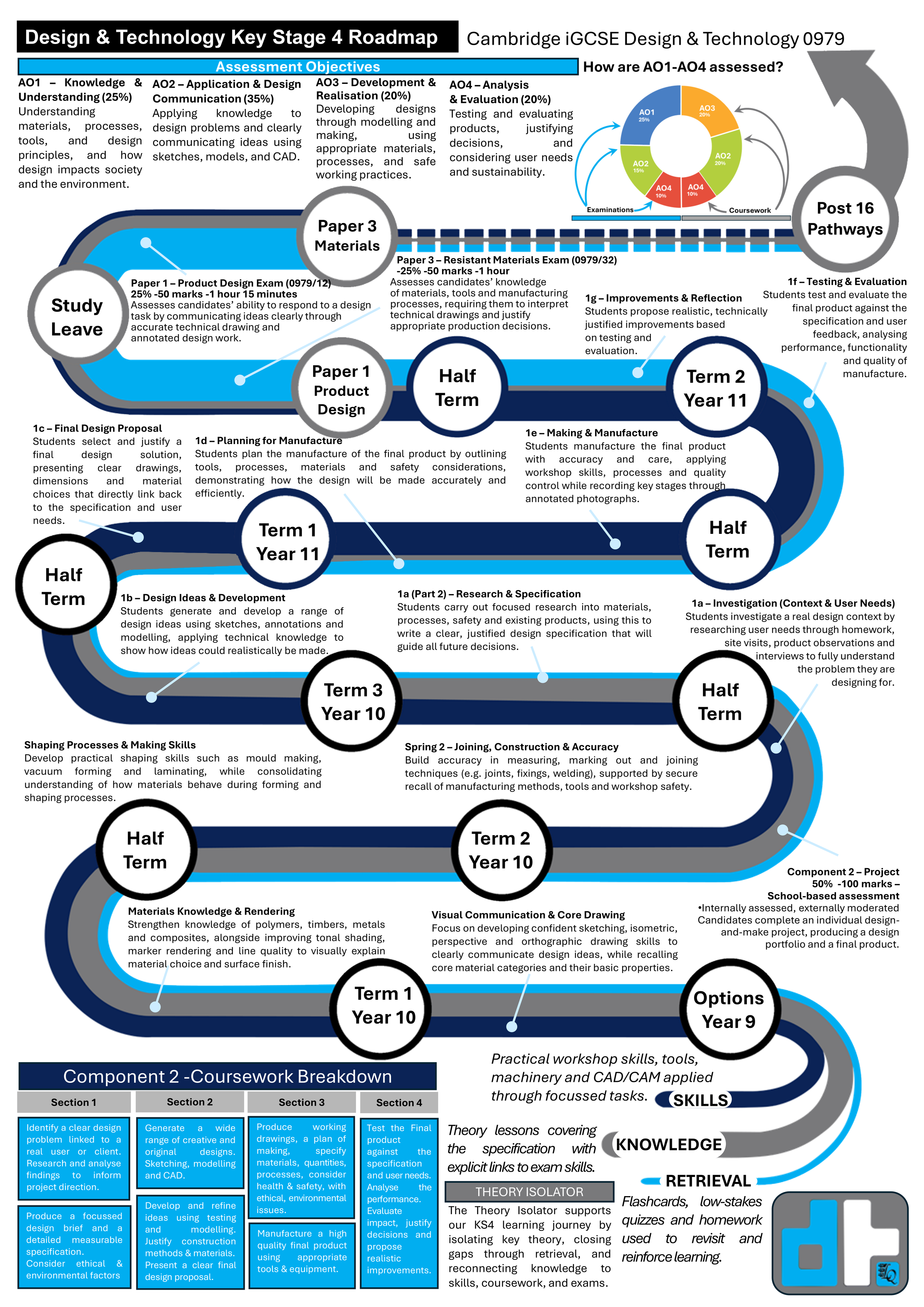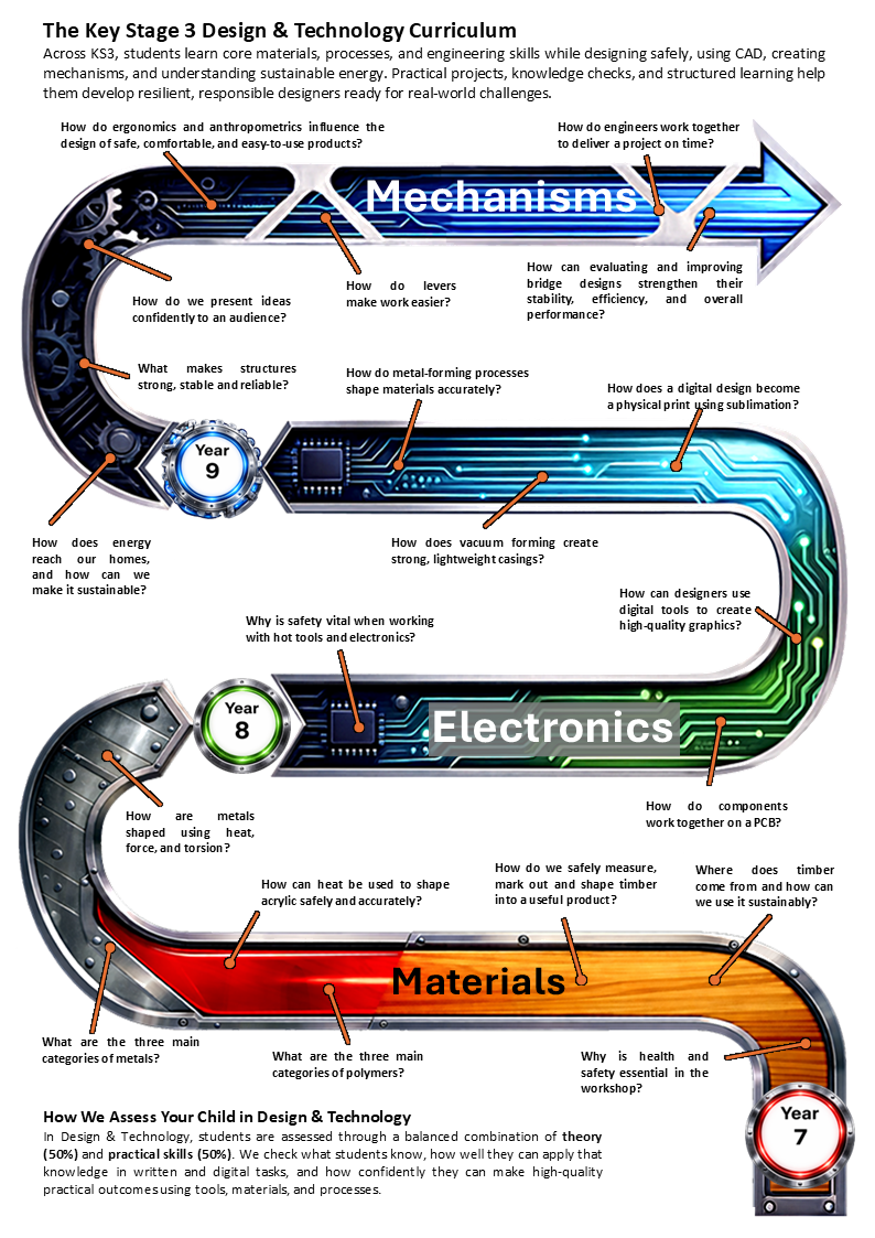 The department firmly believes that students learn best by ‘doing’ and by allowing them to experiment and take risks, in a safe and positive learning environment. We strive to create an environment in which every child will be challenged and supported to realise their potential in an increasingly technological age.This is achieved through imaginative teaching that embraces new technologies and resembles modern industrial processes, whilst retaining the best of traditional practices. At the heart of this, is the desire to deliver a curriculum in which students produce high quality outcomes. Students must learn about the social and ethical responsibilities of designers and engineers and the importance of managing finite resources with care.