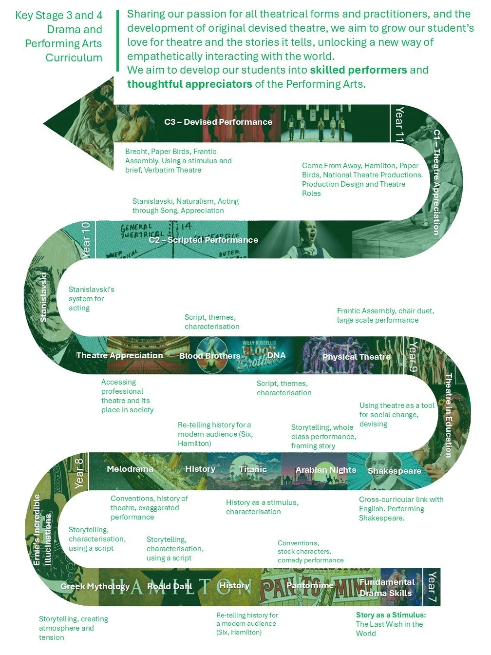 Our curriculum spans a rich variety of units, from exploring scripted drama to experimenting with Melodrama and Physical Theatre. These foundations prepare students for the BTEC Performing Arts course at in Year 10 and Year 11, a highly respected qualification that equips them with the practical skills and professional insight needed to succeed in the industry, as well as to progress to A-Level Performing Arts and further study beyond.