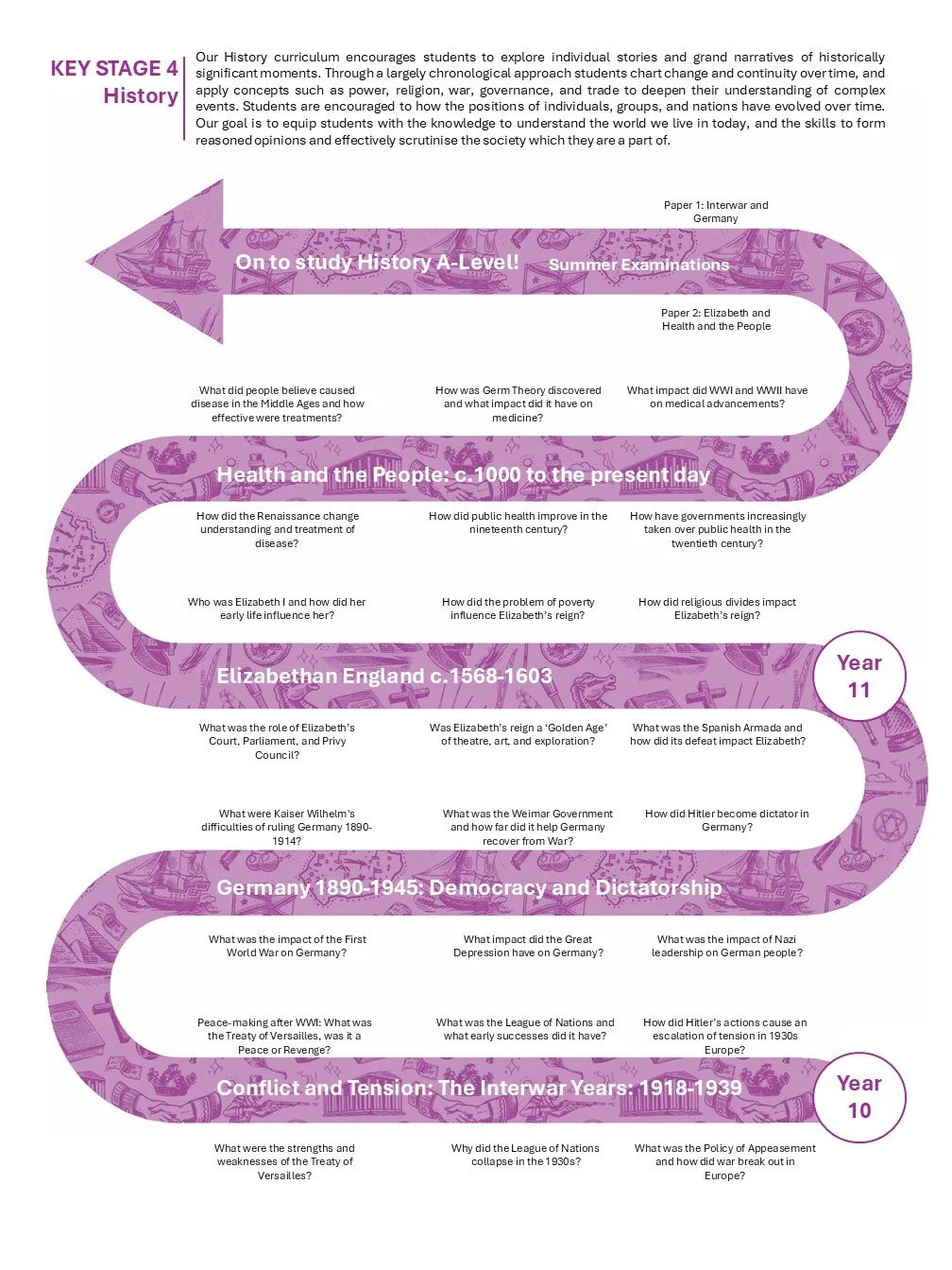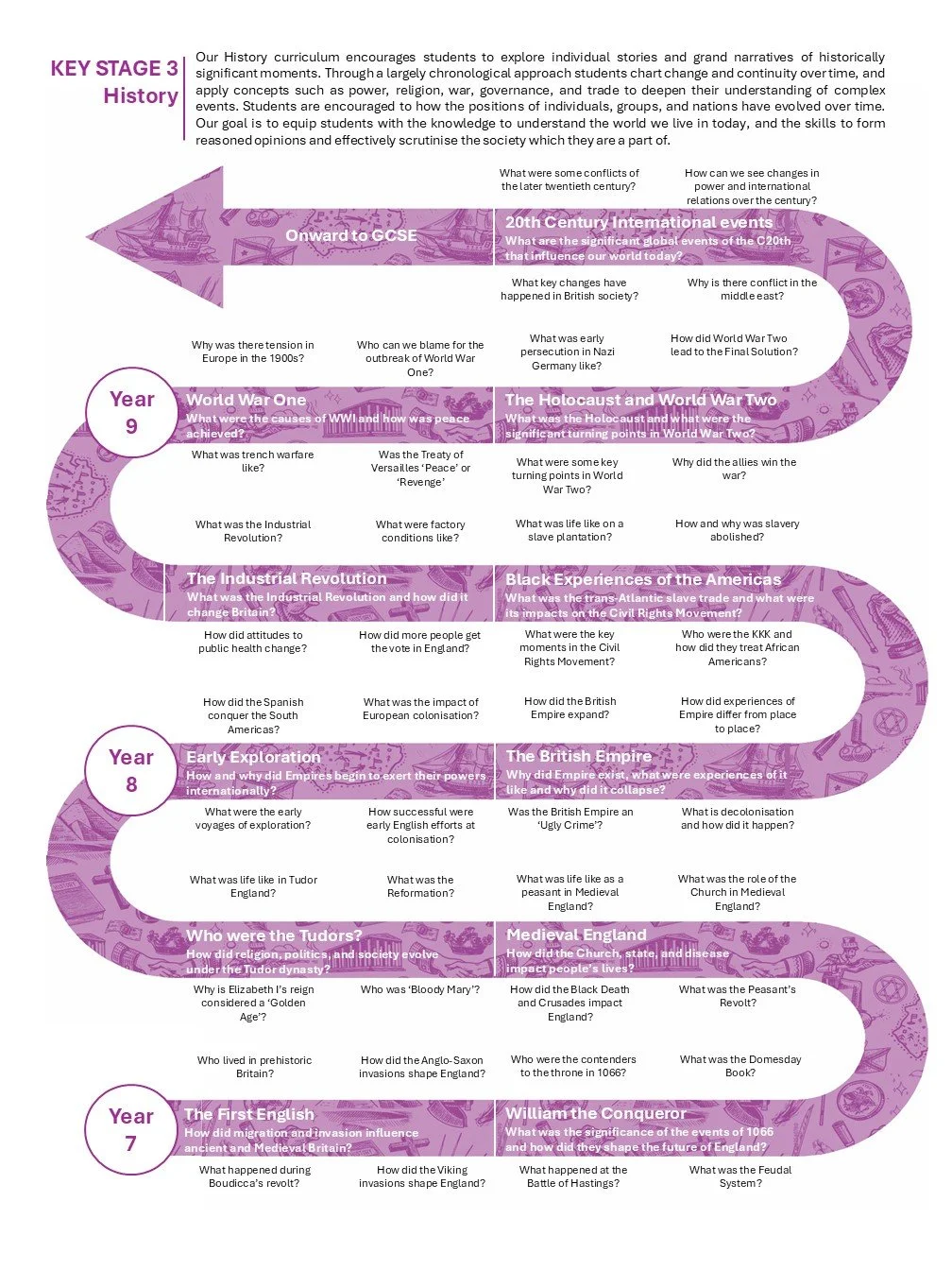 Our study of History focuses on the island story of Britain, interleaving the ongoing themes of immigration, power and society. In Year 7, we examine the lives of the earliest civilisations, the cataclysmic year of invasion in 1066, and the subsequent impact on medieval life. In Year 8, we assess the amount of change that women have experienced over the last 1,000 years, and then within the early modern era we study the revolutionary impact of the Reformation, Renaissance and growth of Empire, supported by the horrors of the slave trade. In Year 9, our study of the industrial revolution sets the foundation of the modern world, which the leads step by inevitable step to the static misery of the First World War trenches, the failure of the bitter interwar years, and the ideological clashes of the Second World War, with a specific focus on the Holocaust.