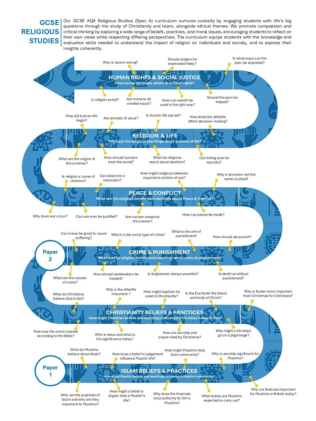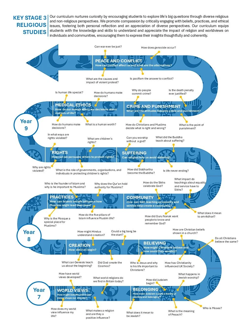 Through our curriculum, we develop student's knowledge and understanding of Christianity in conjunction with other religious traditions and world views that may offer answers to such challenging questions. Religious Studies offers a platform within school to learn from these different beliefs, while exploring individual opinions and values, enabling students to develop their own identity and sense of belonging.